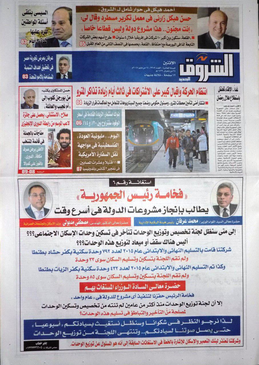 مانشيت “الشروق”: انتظام الحركة وإقبال كبير على الاشتراكات فى ثالث أيام زيادة تذاكر المترو.. انتشار أمنى لتأمين محطات المترو.. ومسئول حكومى: وضعنا جميع السيناريوهات للتعامل مع انعاكسات قرار الزيادة. “الأهرام”: اشتراكات المترو تقفز 400%. “الأخبار”: “الأخبار” ترصد التفاصيل الكاملة لأسعار تذاكر المترو.. 16 جنيهًا التكلفة الحقيقية للتذكرة والزيادة أنقذت الخط الأول من التوقف. “المصري اليوم”: نصف مليون جنيه “فكة” لتخفيف زحام تذاكر “المترو”.. “النقل”: الخطوط تعرضت لـ371 عطلاً.. وتطوير الخطين الأول والثانى يحتاج 30.7 مليار جنيه. “الوطن”: اشتركات شهرية جديدة فى “المترو” من 130 إلى 250 جنيهًا. “اليوم السابع”: “النقل” تستحدث اشتراكا شهريا بالمترو لأول مرة بتخفيض 50%. “اليوم السابع”: وزير النقل فى أول حوار بعد رفع سعر تذكرة المترو: تأخرنا فى القرار 15 عامًا ونعمل على تطوير وتحسين الخدمة. “فيتو”: وزير النقل: لو رفعنا الدعم عن تذكرة المترو هتبقى بعشرين جنيه.. احمدوا ربنا بقى!.