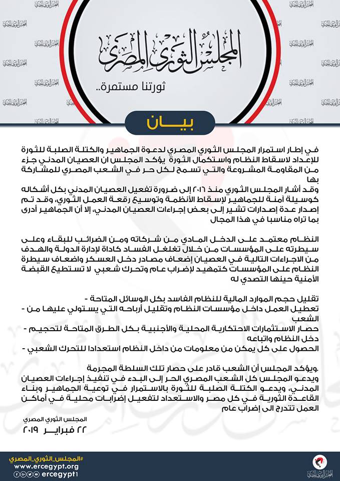 وأكد المجلس أن الشعب قادر على حصار تلك السلطة المجرمة، ودعا جميع المصريين الأحرار إلى البدء في تنفيذ إجراءات العصيان المدني، كما دعا الكتلة الصلبة للثورة بالاستمرار في توعية الجماهير وبناء القاعدة الثورية في كل مصر والاستعداد لتفعيل إضرابات محلية في أماكن العمل تتدرج إلى إضراب عام”.