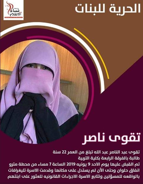 رصدت حركة "نساء ضد الانقلاب"، ضمن الحصاد الأسبوعي لأحوال المعتقلات المصريات في سجون الانقلاب، اعتقال عدد من الفتيات من منازلهن خلال الأيام الماضية واقتيادهن إلى جهة غير معلومة، من بينهن الطالبتان مودة أسامة العقباوي "18 عامًا"، ولؤيا صبري "24 عامًا".