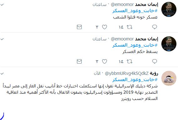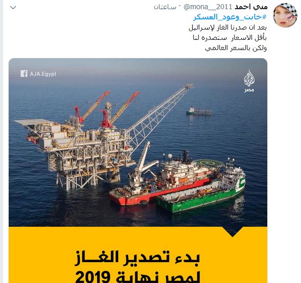 وكتب معاذ محمد الدفراوي: “إن الله لا يصلح عمل المفسدين”، فيما كتبت أفنان: “العسكر لا يعرف إلا لغة القتل والدم ونهب أموال الشعب وعود كاذبة لعسكر خونة..العسكر ليس له وعود بل خراب باعوا الارض والعرض وحتى الغاز الذي نصدرة لليهود، اليهود هيصدروا الينا يعنى يسرقوا غازنا خيرنا ونستوردة منهم خراب يامصر حكم العسكر”