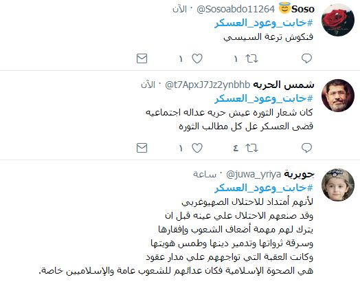 وكتبت إيمان محمد: “عسكر خونه قتلوا الشعب” فيما كتبت عاشقة البنفسج: “لا حرية ولا عدالة ولا كرامة ولا اي حياة في عهد العسكر حسبنا الله ونعم الوكيل”، وكتب أبوخليل: “خابت وعود العسكر.. ملناش رغبة ولا ارادة فى حكم مصر”، وكتبت بيسان: “أكبر نكسه لمصر الانقلاب العسكري على مصر وقتل أول رئيس مدني منتخب بإرادة مصريه حرة”