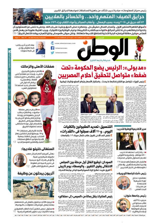 أولا، أبرزت الصحف أنشطة السيسي وتصريحاته، حيث جاء في «مانشيت الأخبار»:.. الرئيس يهنئ الشعب السوداني باتفاق المرحلة الانتقالية.. السيسي يشيد ببطولات وتضحيات رجال القوات المسلحة..استعراض خطط رفع الكفاءة والتدريب على أحدث منظومات التسليح. وتضيف «الأخبار»:.. رسالة من السيسي إلى سيلفاكير ينقلها رئيس المخابرات العامة..القائم بأعمال السفير الأمريكي: مصر سوق جيد للاستثمار وعلاقتنا معها ممتازة. وبحسب «مانشيت الوطن»:.. «مدبولي»: الرئيس يضع الحكومة «تحت ضغط» متواصل لتحقيق أحلام المصريين..رئيس الوزراء: نتواصل مع الشارع لمتابعة ما يحدث.. واستقرار الأسعار وتوافر السلع مؤشرات إيجابية. ووفقا لـ «مانشيت اليوم السابع»:.. السيسى: مصر تسابق الزمن من أجل بناء دولة عصرية حديثة.. الرئيس يجتمع بوزير الدفاع ورئيس الأركان.. ويؤكد الاهتمام ببناء الفرد المقاتل داخل القوات المسلحة ويشدد على ضرورة مواكبة أحدث النظم العالمية فى التسليح والتدريب.. ويوجه التحية والتقدير لشهداء الوطن الأبرار.