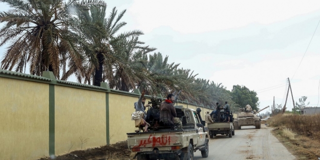 Vehicles belonging to Libyan fighters loyal to the Government of National Accord (GNA) are pictured during clashes against forces loyal to strongman Khalifa Haftar, on June 1, 2019, in al-Sawani area, south of the Libyan capital Tripoli. (Photo by Mahmud TURKIA / AFP)