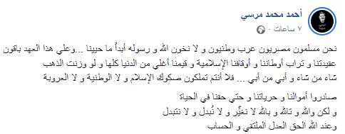 وكتب أحمد، عبر صفحته على فيسبوك: "نحن مسلمون مصريون عرب وطنيون و لا نخون الله ورسوله أبدا ما حيينا.. وعلى هذا العهد باقون.. عقيدتنا و تراب أوطاننا و أوقافنا الإسلامية و قيمنا أغلى من الدنيا كلها ولو وزنت الذهب شاء من شاء وأبى من أبى … فلا أنتم تملكون صكوك الإسلام و لا الوطنية و لا العروبة".