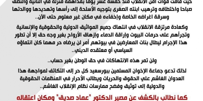 أدانت جماعة الإخوان المسلمين ببورسعيد استمرار إخفاء داخلية الانقلاب للدكتور "عماد صديق"، لليوم الخامس عشر على التوالي منذ اعتقاله من منزله.