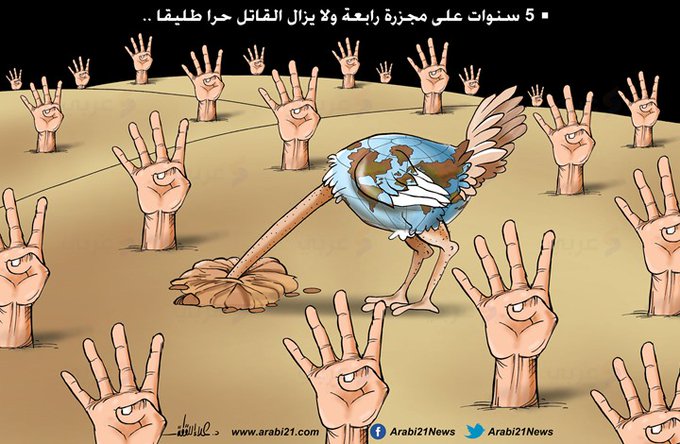 وكتب حساب "ميدل إيست مونيتر" ضمن سلسلة التغريدات تغريدة استنكر فيها دعم المجتمع الدولي لقتلة المعتصمين السلميين في رابعة وقال "في هذا اليوم، تم ذبح مائة شخص في مذبحة وحشية ارتكبها الجيش المصري، مع إطلاق النار على الناس وإحراقهم أحياء.. على الرغم من ذلك استأنف المجتمع الدولي تصدير الأسلحة إلى مصر بعد فترة وجيزة من مجزرة".