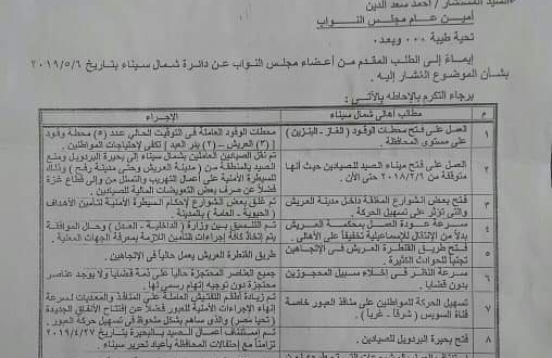 وتحمل الوثيقة ردود قادة جيش الانقلاب علي أعضاء برلمان الانقلاب من أبناء سيناء بشأن مشكلات المحافظة ، وتشمل عشر طلبات متنوعة لنواب شمال سيناء ورد وزارة الدفاع عليها، حيث يرفض جيش الانقلاب طلب لفتح محطات وقود إضافية بالمحافظة بدعوي أن "محطات الوقود العاملة في التوقيت الحالي، وعددها 5 محطات، كافية لاحتياجات المواطنين"، كما يرفض طلبا بفتح ميناء الصيد للصيادين بعد إغلاقه منذ فبراير من العام الماضي حتى الآن، بدعوي أنه "تم نقل الصيادين العاملين في شمال سيناء إلى بحيرة البردويل ومنع الصيد بالمنطقة من مدينة العريش وحتى مدينة رفح، وذلك بهدف تحقيق السيطرة الأمنية على أعمال التهريب والتسلل من وإلى قطاع غزة".