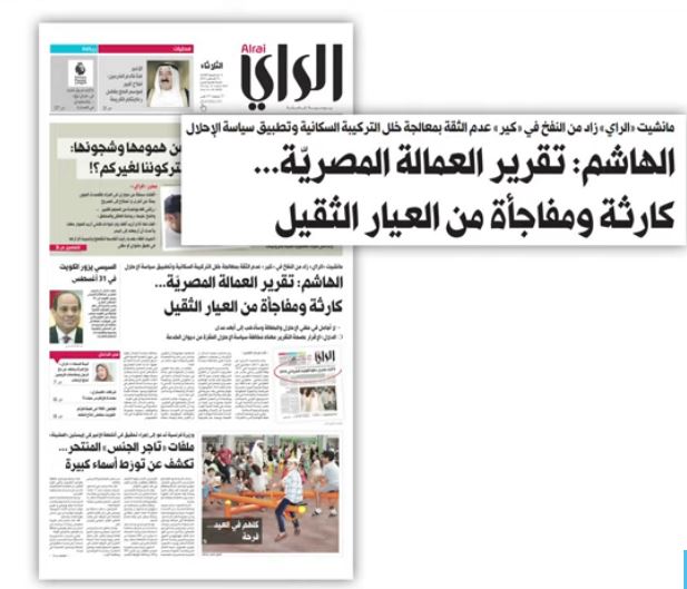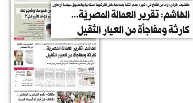 حتى أن مانشيت “الراي” الكويتية قال إن معدل دخول المصريين شهريا في 2018، وصل إلى 8 آلاف مصري، وفقا لتقرير رسمي بات مادة لجدل نيابي – حكومي، ففي حين وصفت النائب صفاء الهاشم الأمر بـ«الكارثة»، رأى النائب محمد الدلال أن الأرقام، إن صحت، ستكون دليلا على مخالفة سياسة الإحلال.
