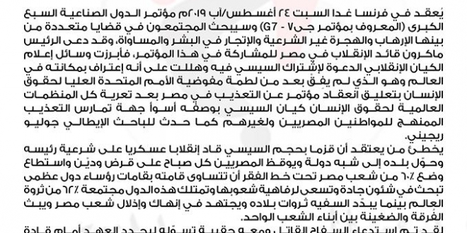وقال المجلس، في بيان له: “يُعقد في فرنسا اليوم السبت ٢٤ أغسطس ٢٠١٩ مؤتمر الدول الصناعية السبع الكبرى (المعروف بمؤتمر جى٧ – G7) وسيبحث المجتمعون في قضايا متعددة من بينها الإرهاب و الهجرة غير الشرعية والإتجار في البشر والمساواة، وقد دعا الرئيس ماكرون قائد الانقلاب في مصر للمشاركة في هذا المؤتمر، فأبرزت وسائل إعلام الكيان الانقلابي الدعوة لاشتراك السيسي فيه وهللت على أنه اعتراف بمكانته في العالم وهو الذي لم يفِقْ بعد من لطمة مفوضية الأمم المتحدة العليا لحقوق الإنسان بتعليق انعقاد مؤتمر عن التعذيب في مصر بعد تعرية كل المنظمات العالمية لحقوق الإنسان كيان السيسي بوصفه أسوأ جهة تمارس التعذيب الممنهج للمواطنين المصريين ولغيرهم كما حدث للباحث الإيطالي جوليو ريجيني”.