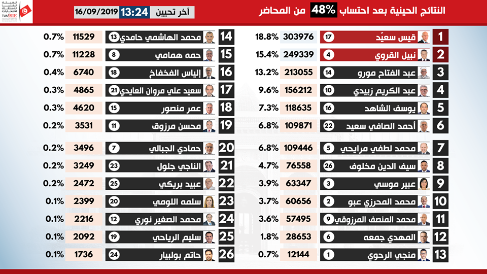 ويرى مراقبون أن عبد الفتاح مورو، وعبد الكريم الزبيدي ممثل العسكر وهو وزير الدفاع السابق في تونس، كانا صريحين في ولائهما، أحدهما لثورة الياسمين والآخر لقطاع الثورة المضادة، إلا أن قيس سعيد أستاذ القانون الدستوري ونبيل قروي النافذ إعلاميًّا واقتصاديًّا من خلال إدارته قناة نسمة وأعمال تجارية، لم تبرز لهما اتجاهات، إلا أنَّ حديثا للشارع يقرب سعيد من الإسلاميين، وينسب القروي والمحبوس حاليا لرجال الأعمال المحسوبين على العلمانيين والبعيد عن الإسلاميين، حتى إن مواقع وقنوات نسبت حبسه لعبد الفتاح مورو والنهضة، مع وجود من يحسبهم على المستقلين ويعتبر النتائج هزيمة للأحزاب والسياسيين؛ لعدم تلبيتهم مطالب الشعب.