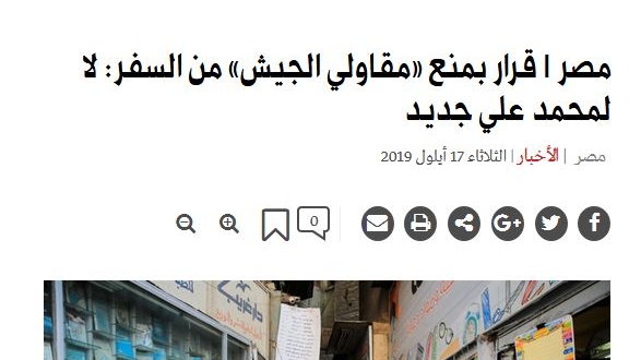 أكدت صحيفة الأخبار اللبنانية ما تسرب من أنباء على مدى العشرة أيام الأخيرة من أن حكومة الإنقلاب أصدرت تعليمات مشددة تمنع فيها سفر جميع المقاولين المصريين المتعاقدين مع الجيش، وطلب القيام بتحقيقات أمنية بشأنهم واحدًا واحدًا، لمنع تكرار أزمة المقاول محمد علي.