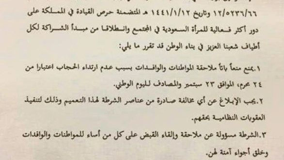 وزعم التعميم المتداول أنه بناءً على برقية وزير الداخلية، يمنع منعًا باتًا ملاحقة المواطنات والوافدات بسبب عدم ارتداء الحجاب اعتبارًا من 24 محرم، الموافق 22 سبتمبر، والمصادف لليوم الوطني.