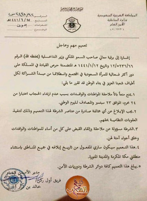 تداول نشطاء على مواقع التواصل الاجتماعي "فيسبوك" و"تويتر"، تعميمًا منسوبًا لوزارة الداخلية السعودية، موجهًا إلى مراكز الشرطة في كافة مناطق المملكة، بشأن النساء في احتفالات اليوم الوطني.