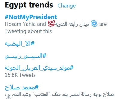 تمكن النشطاء في مصر من رفع تغريداتهم على هاشتاج #NotMyPresident وترجمته "السيسي مش رئيسي" حتى تصدر الوسم الأعلى تداولا في مصر بين هاشتاجات أخرى أطلقها لجان السؤون المعنوية، ودلالة الهاشتاج مقصود منه الأمم المتحدة والولايات المتحدة اللتان يبديان ترحيبا بالسيسي فيسمحان بلقاء رئيس أكبر دولة في العالم لديكتاتور ولص سرق شعبه وحرمه بقصوره وفيلاته حتى صار واحد من كل 3 مصريين فقراء.