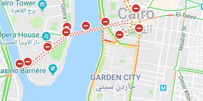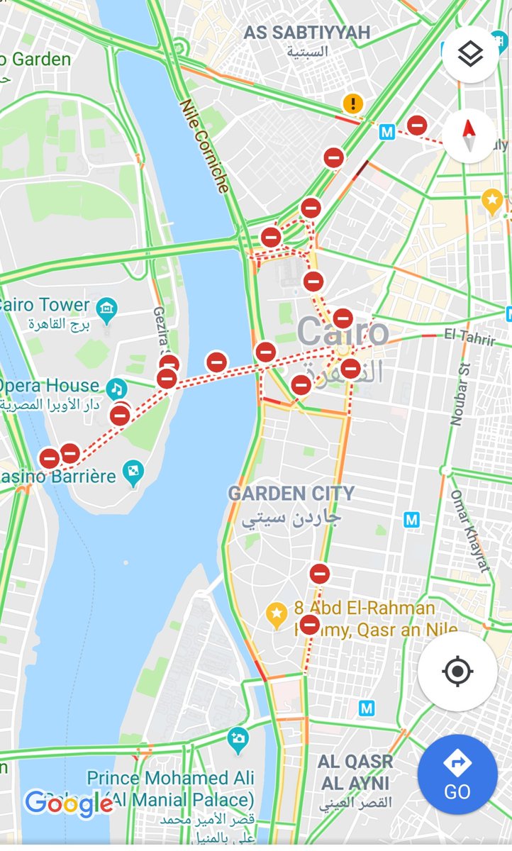 كما أظهرت خرائط جوجل إغلاقا تاما للطرق المؤدية إلى ميدان التحرير ” الأوبرا والسادات وعبدالناصر وعرابي” وسط القاهرة، وهو ما يظهر أيضا لمستخدمي برامج (GBS).