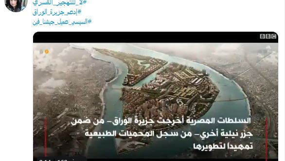 وضمن الهاشتاج تناول النشطاء عمليات التهجير القسري التي تتم لسكان الوراق البالغ مساجتها 1400 فدان