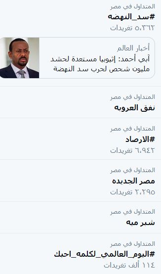 تصدر هشتاج "#سد_النهضة" موقع "تويتر" بالتزامن مع تهدي رئيس الوزراء الاثيوبي لمصر بالحرب بهدف حماية سد النهضة الذي تشيده إثيوبيا ويحذر خبراء من خطورته وآثاره السلبية على حصة مصر من مياه النيل، وأكد المغردون ضرورة إسقاط السيسي وعصابة العسكر بعد تفريطهم في حصة مصر من مياة النيل بالتوقيع على اتفاقية بناء السد.
