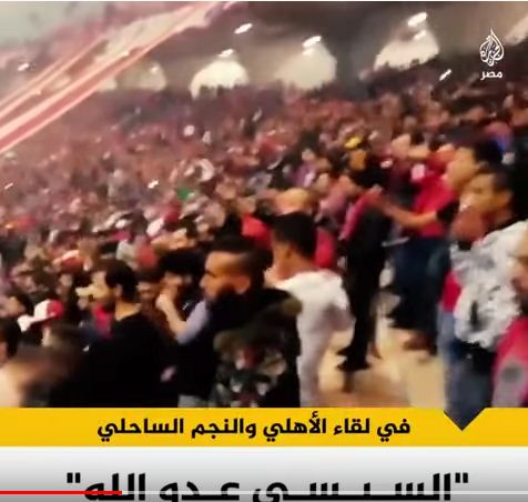 تداول روّاد مواقع التواصل الاجتماعي، مقطع فيديو يُظهر هتاف جماهير “النجم الساحلي” التونسي ضد قائد الانقلاب العسكري عبد الفتاح السيسي، خلال المباراة التي جمعت بين فريقهم مع النادي الأهلي المصري، أمس الجمعة، في العاصمة التونسية، حيث يظهر الفيديو تعالي أصوات الجماهير في المدرجات بهتاف “لا إله إلا الله.. السيسي عدو الله”.