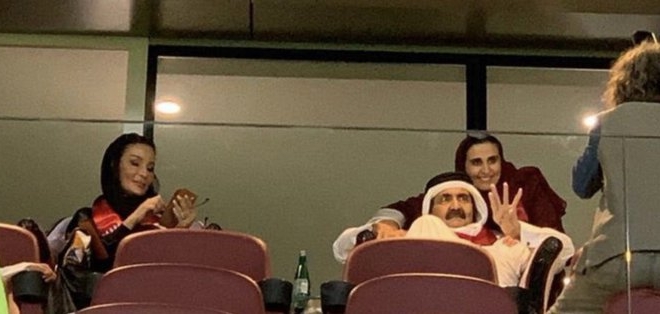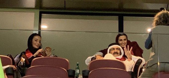ونشر الناشط القطري “حمد لحدان المهندي” مقطع للشيخة موزة بنت ناصر المسند، زوجة أمير دولة قطر السابق الشيخ حمد بن خليفة آل ثاني ووالدة أمير قطر، وهي ترفع شارة رابعة بعد فوز المنتخب القطري، قائلا: “تستاهل الفرحة صاحبة السمو”.
