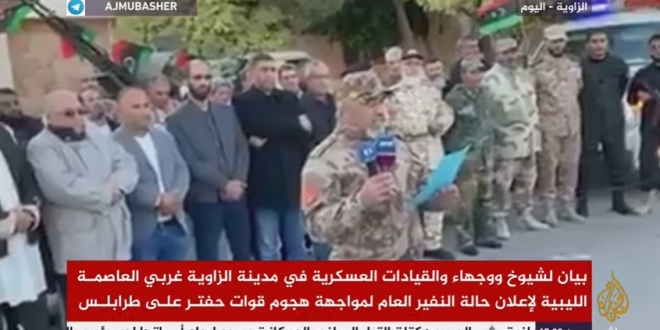 فإلى أين تتجه التطورات الميدانية في ليبيا بعد إعلام مصراتة وزليتين النفير العام نصرة لطرابلس ولصد هجوم قوات حفتر؟ وما مستقبل الأزمة في ليبيا على ضوء المواقف الإقليمية والدولية من هجوم محتمل قد تشنه قوات حفتر يستهدف حكومة الوفاق؟.