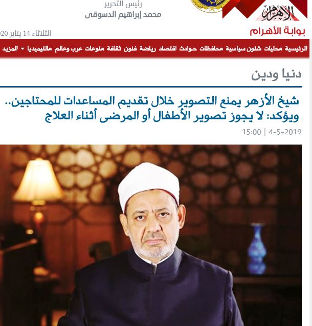 ووجَّه الطيب بمنع التصوير أثناء تقديم المساعدات أو تقديم الزكاة أو الصدقات أو الخدمات للمستحقين، من بيت “الزكاة والصدقات” المصري التابع للأزهر الشريف.
