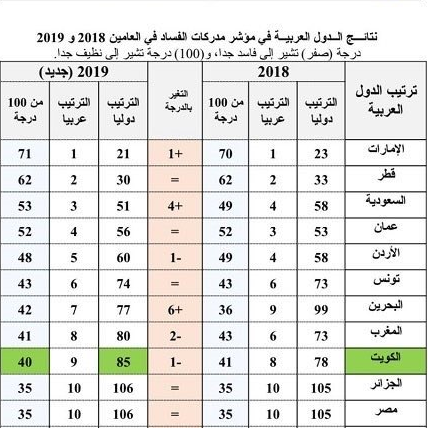 كما رصد التقرير تراجع الكويت درجة واحدة هذا العام، حيث حلت في المركز الـ9 عربيًّا والـ85 عالميًّا لعام 2019، وهو ما انعكس على تراجع الكويت 7 مراكز في مؤشر مدركات الفساد.