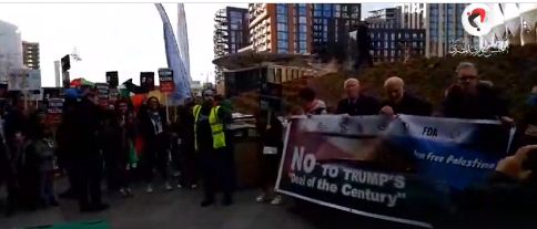 نظَّم عدد من أبناء الجالية المصرية والعربية في بريطانيا وقفة أمام السفارة الأمريكية في لندن؛ رفضًا لما تُعرف بـ”صفقة القرن” التي تهدف إلى تصفية القضية الفلسطينية وفقًا للرؤية الصهيوأمريكية وبرعاية الأنظمة العربية.