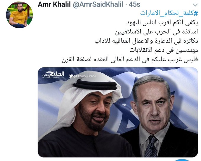 ولهذا قال “حامد عبد ربه”: “#كلمة_لحكام_الامارات.. نعلم أنكم دعمتم صفقة القرن، اعلموا أن حِلم الله عليكم له نهاية”.