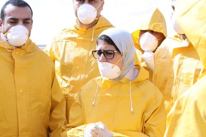 وتفقَّدت الدكتورة هالة استعدادات استقبال المصريين العائدين من مدينة ووهان الصينية التي انتشر منها فيروس كورونا في مطار “العلمين”، وهي ترتدي زيًّا أصفر واقيًا وكمامة على الوجه تظهر أنفها!.