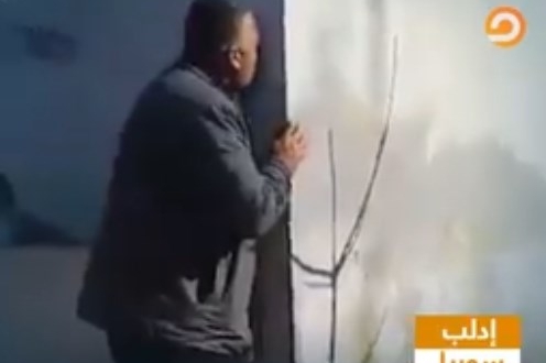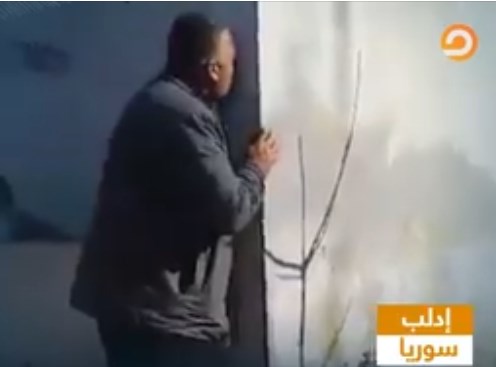 ويَظهر في الفيديو مشهدٌ مؤثرٌ لمواطن سوري يقبِّل بيته الذي أُجبر على النزوح منه نتيجة القصف المستمر من قوات الأسد وروسيا، ثم يرفع يده إلى السماء ويبتهل إلى الله بالدعاء على بشار الأسد. قائلا: “الله ينتقم منك يا بشار حرمتنا من دارنا الله ينتقم منك”.