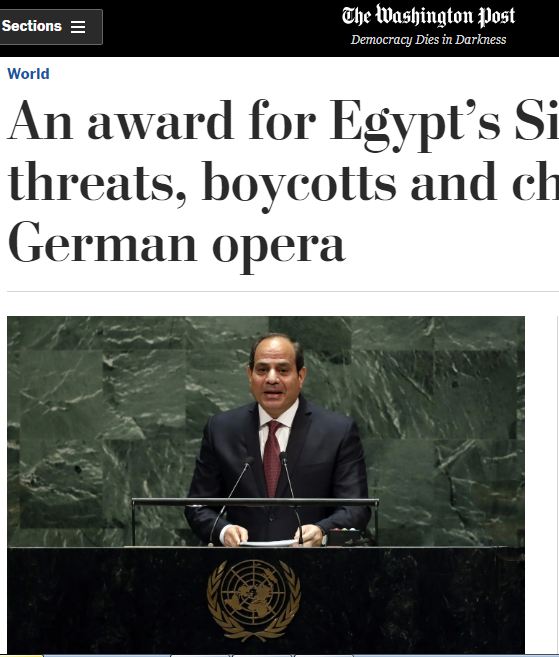 قالت صحيفة “واشنطن بوست” الأمريكية، إن الجائزة التي حصل عليها المنقلب السيسي من أوبرا “سيمبر” جلبت التهديدات والمقاطعات والفوضى إلى الأوبرا الألمانية.