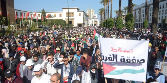 ففي المغرب، تظاهر الآلاف بالعاصمة الرباط، بدعوة من هيئات وأحزاب ونقابات مغربية، وانطلقت المسيرة التي نظمت تحت شعار “مسيرة الشعب المغربي، جميعًا من أجل فلسطين حرة، وضد صفقة العار المشئومة”، من باب “الحد التاريخي” تجاه مبنى البرلمان.