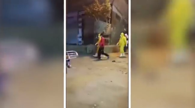 ويظهر مقطع الفيديو اصطحاب فردين من هيئة الإسعاف يرتديان بدلات وكمامات واقية لشخصين يشتبه في إصابتهما بفيروس كورونا الجديد.