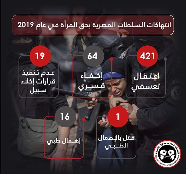 رصد إنفوجراف أصدرته “التنسيقية المصرية للحقوق والحريات” انتهاكات سلطات الانقلاب ضد المرأة المصرية في عام 2019، والتي بلغت 521 انتهاكًا متنوعًا لحقوق المرأة.