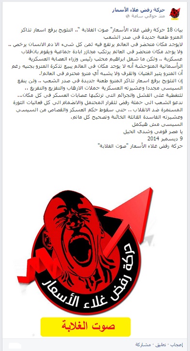 أضافت الحركة -خلال بيان لها، نشر عبر صفحتها بموقع "فيس بوك": ما يشغل ابراهيم محلب رئيس وزراء العصابة العسكرية الرأسمالية المتوحشة أنه لا يوجد مكان في العالم يبيع تذكرة المترو بجنيه، على الرغم من أن المترو يثير الغثيان والقرف، ولا يشبه أي مترو محترم في العالم!.