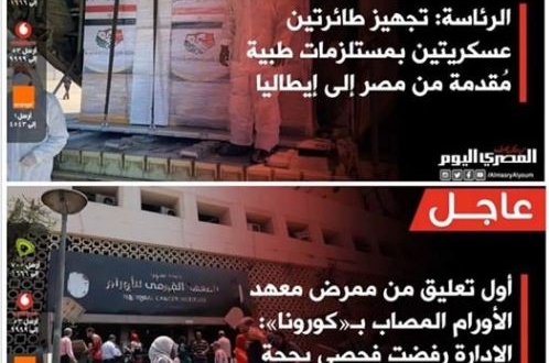 أما أحمد شعراوي فكتب: "وزيرة الصحة تصل إلى إيطاليا بمستلزمات طبية من مصر بعد توجيه من السيسي بإرسال طائرتين عسكريتين كمساعدات لها، في حين أن العالم بيتخانق على المستلزمات الطبية، وفي حين أن في مستشفيات مصرية تعاني من النقص من المستلزمات.. لكن واضح السيسي بيعالج قضية ريجيني على دم الشعب المصري".