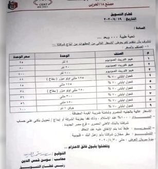 واشترطت الشركة دفع شركات التوزيع 100% من القيمة عند الاستلام نقدا بخزينة الشركة، أو بتحويل بنكي على حسابها بالبنك الأهلي المصري (فرع مصر الجديدة)، والتسليم بمخازن الشركة بمنطقة أبو زعبل البلد في محافظة القليوبية؛ الأمر الذي يخالف ما تم نشره في الجريدة الرسمية، في عددها الصادر يوم 17 أبريل 2020، لقرار رئيس حكومة الانقلاب رقم 17 لسنة 2020 بتحديد أسعار بيع بعض المنتجات اللازمة لمواجهة فيروس كورونا.