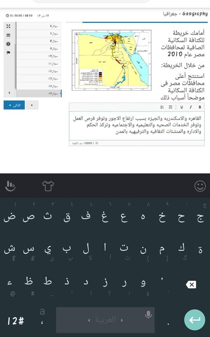 ويؤدي طلاب الصف الأول الثانوي، بإجمالي ٥٨٩ ألف طالب وطالبة، اليوم الأربعاء، امتحان الفصل الدراسي الثاني في الجغرافيا، إلكترونيًا من المنازل.