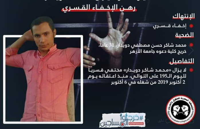 تتواصل الجريمة ذاتها في أسوان للشاب محمد شاكر حسن مصطفى دويدار، 31 عاما، خريج كلية دعوة جامعة الأزهر، منذ اعتقاله يوم 2 أكتوبر 2019 من شغله في 6 أكتوبر، دون سند قانوني، واقتياده لجهة غير معلومة حتى الآن.