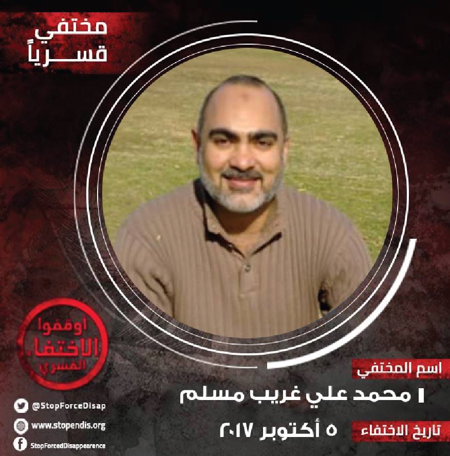 كما جددت أسرة المختفي قسريا محمد علي غريب مسلم، 46 عاما، أخصائي تسويق، مطالبتها بالكشف عن مكان احتجازه القسري منذ اعتقاله بتاريخ 5 أكتوبر 2017، على يد قوات الانقلاب بمطار القاهرة الدولي فور عودته من المملكة العربية السعودية على متن الرحلة رقم 684 Ms التابعة لشركة مصر للطيران في الساعة السادسة صباحًا، دون سند قانوني واقتياده لجهة غير معلومة حتى الآن.