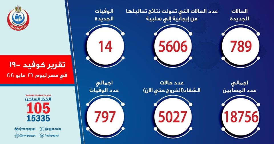 فعلى الصعيد المحلي، أعلنت وزارة الصحة في حكومة الانقلاب عن ارتفاع إجمالي المصابين بفيروس كورونا المستجد، حتى اليوم الثلاثاء، إلى 18756 بعد تسجيل 789 حالة إصابة جديدة، وارتفاع عدد الوفيات إلى 797 حالة وفاة بعد تسجيل 14 وفاة جديدة.