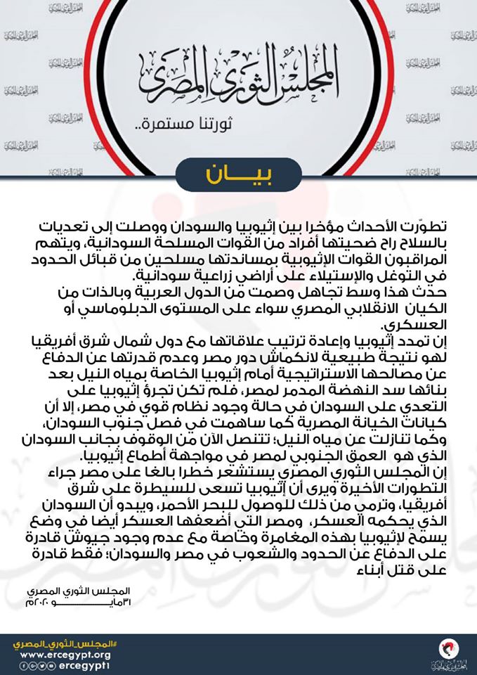 وأضاف المجلس "نستشعر خطرا بالغا على مصر جراء التطورات الأخيرة، ونرى أن إثيوبيا تسعى للسيطرة على شرق إفريقيا، وترمي من ذلك للوصول إلى البحر الأحمر، ويبدو أن السودان الذي يحكمه العسكر، ومصر التي أضعفها العسكر أيضا في وضع يسمح لإثيوبيا بهذه المغامرة وخاصة مع عدم وجود جيوش قادرة على الدفاع عن الحدود والشعوب في مصر والسودان؛ فقط قادرة على قتل أبناء وطنها".