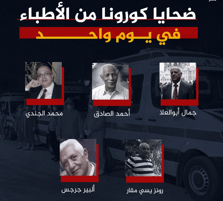 أعلنت نقابة الأطباء عن وفاة 8 أطباء منذ أمس إلى اليوم (5 الأحد و3 الاثنين)، متأثرين جميعًا بإصابتهم بفيروس كورونا أثناء تأدية عملهم، ليرتفع إجمالي وفيات الأطباء إلى 31 طبيبا، بينما يبلغ عدد الإصابات 372 طبيبا.