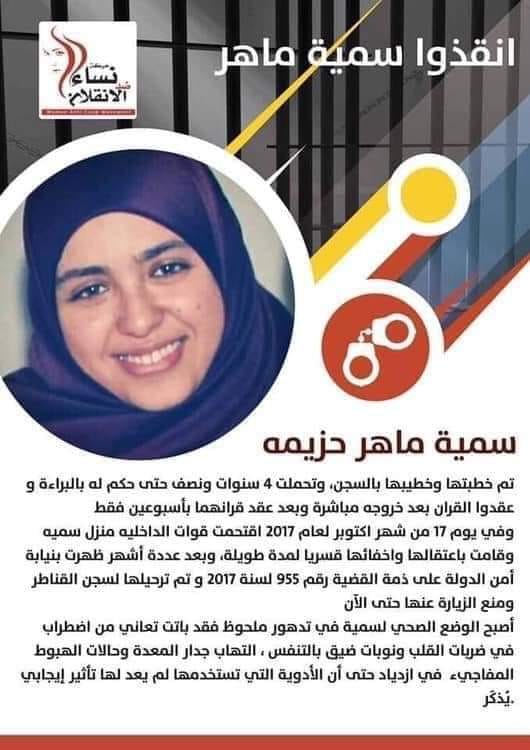 وجددت حركة "نساء ضد الانقلاب" مطالبها بضرورة وقف الانتهاكات والجرائم التى تتعرض لها المرأة المصرية، وإخلاء سبيل جميع المغيبات فى سجون الانقلاب، بينهن سمية ماهر حزيمة.