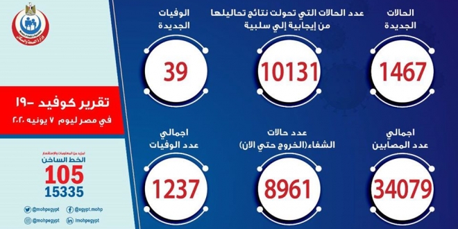 فعلى الصعيد المحلي، أعلنت وزارة الصحة في حكومة الانقلاب عن ارتفاع عدد المصابين بفيروس كورونا المستجد، حتى اليوم الأحد، إلى 34079 حالة بعد تسجيل 1467 إصابة جديدة، وارتفاع عدد الوفيات إلى 1237 حالة وفاة بعد تسجيل 39 وفاة جديدة.