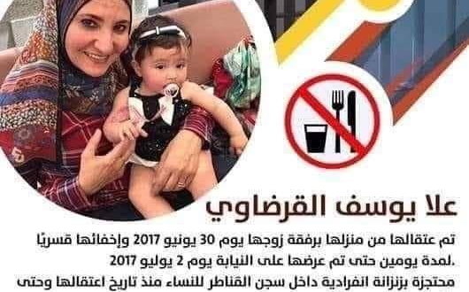 وتابعت “أكثر من سنتين في زنزانة انفرادية، ممنوع عنها الدواء والطعام، يُخيم الحزن والكسرة وجهها، تعامل أسوأ معاملة لأنها فقط تحمل اسم القرضاوي!”. واختتمت بالمطالبة بالحرية لعلا القروضاوي!