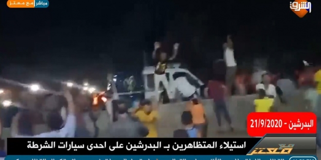وفي البدرشين بمحافظة الجيزة استولى المتظاهرون على مدرعة شرطة منذ قليل عقب فرار قوات الشرطة وتم إحراقها بعد ذلك.