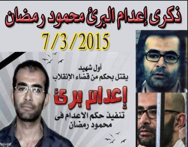 لم يكن 7 مارس 2015 فقط ذكرى إعدام الثائر البريء محمود رمضان، المحاسب الذي كان يقيم في الإسكندرية، بل كان أول شخص معتقل يعدمه الطاغية عبدالفتاح السيسي ، رئيس عصابة الانقلاب، ووزير داخليته، من بين السجناء الذين صدرت بحقهم أحكام جائرة بالإعدام في محاكمات سياسية افتقرت لأدني معايير العدالة والنزاهة.