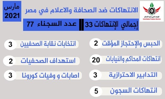 وثق المرصد العربى لحرية الإعلام 33 انتهاكا للصحافة والإعلام خلال شهر مارس 2021، بينها مواصلة سيطرة الشركات التابعة للمخابرات المصرية على المنابر الإعلامية والتى كان آخرها الاستحواذ على قناة لمحور وجريدة المصري اليوم. وكشف المرصد، فى تقريره الشهري، أن انتهاكات المحاكم والنيابات جاءات على رأس الانتهاكات بعدد 20 انتهاكا، تليها انتهاكات السجون بـ(5)انتهاكات، ثم 3 انتهاكات خلال انتخابات نقابة الصحفيين بالتساوي مع التدابير الاحترازية، ثم الحبس والاحتجاز المؤقت بانتهاكين، واستهداف الصحفيات بانتهاكين.
