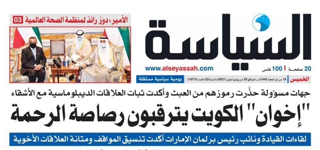 وبالتزامن مع تكثيف الأذرع الإماراتية، هجومها على إخوان الكويت والحديث عن أن "الدور عليهم بعد إخوان تونس"، نشرت صحيفة "السياسة" الكويتية 28 يوليو/ تموز 2021 مانشيت تحريضي يقول "إخوان الكويت يترقبون رصاصة الرحمة".